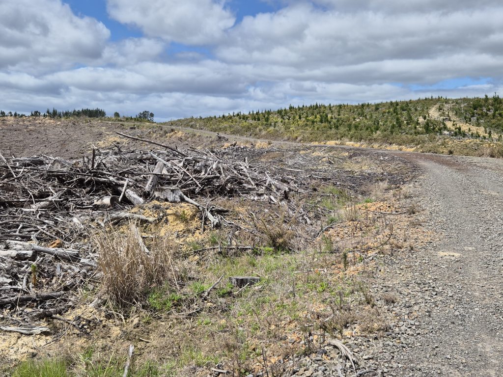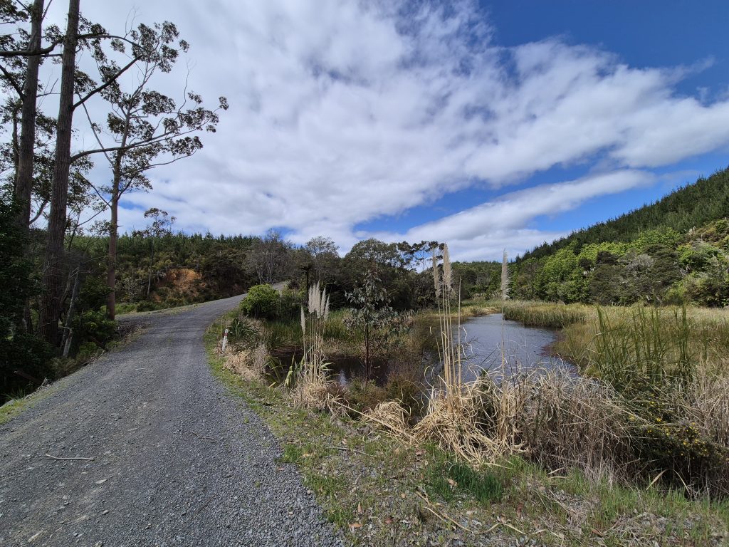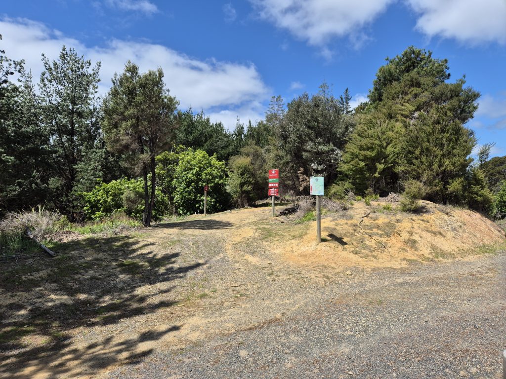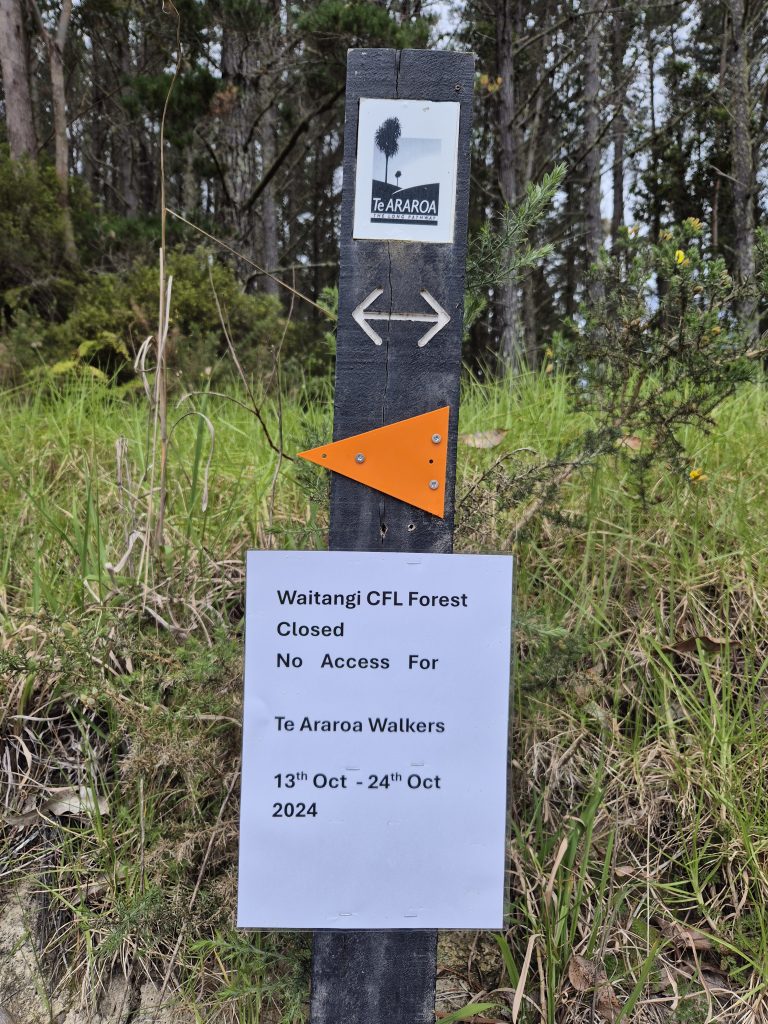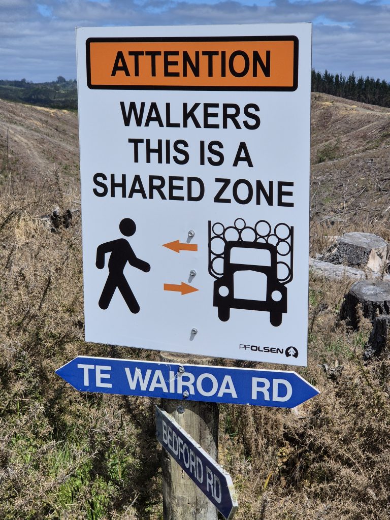 Der var en kedelig times gåtur hen til starten af Waitangi Forest track. Noterne og skiltningen gjorde det klart, at der arbejdede mange store maskiner i skoven, og at man skulle gøre sig synlig. Jeg havde arrangeret et gult refleksforklæde, som jeg bandt på rygsækkens stropper, så det dækkede min brystkasse.