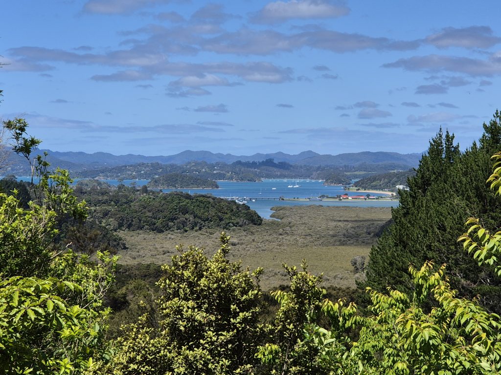 Nu var udsigten til Bay of Islands tydelig. Der var flot. Blåt vand, grønt græs, klippeøer og sejlskibe. Vi havde nu vandret fra vestkysten ind over Nordøen og ud til østkysten.