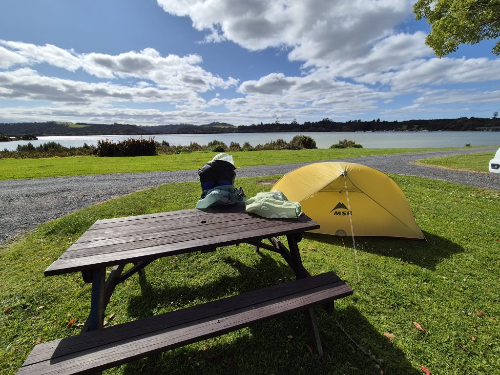 Jeg opgav at starte museumsbesøget den dag og gik i stedet halvanden kilometer længere frem til Waitangi Holiday Park. Her slog jeg teltet op med udsigt til vandet, fandt madposen frem og gik ind i køkkenet. Her sad der to af mine vandrevenner.