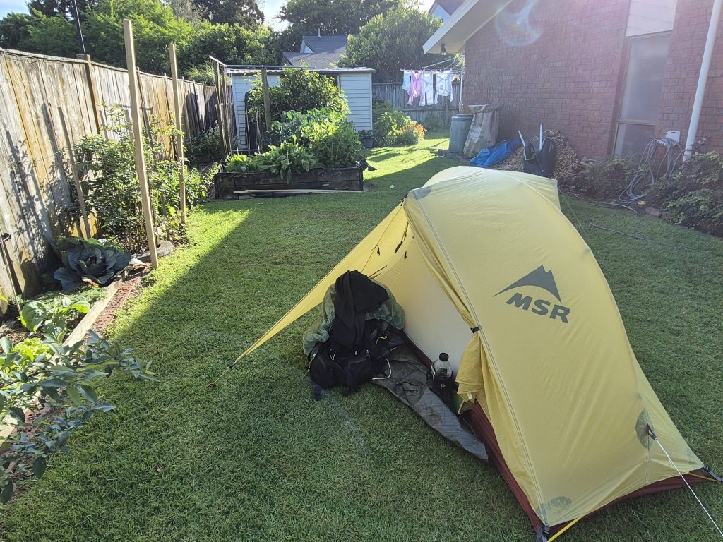 Omkring klokken fire svingede jeg væk fra en stor vej og ud i et villakvarter. Her har venlige mennesker ladet mig campere i haven. Jeg har været i brusebad og tøjet har været i vaskemaskinen.