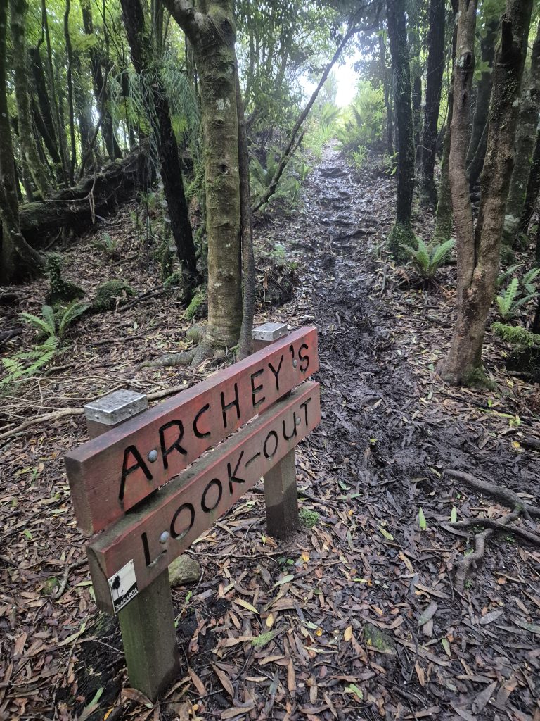 Jeg fortsatte, hvor jeg slap i går. Det gik opad mod to udsigtspunkter. Det første bemærkede jeg ikke. Det var vist bare en lysning på en bakketop. Det næste var Archey’s Lookout. Det var afmærket, fordi det var en lille afstikker fra stien.