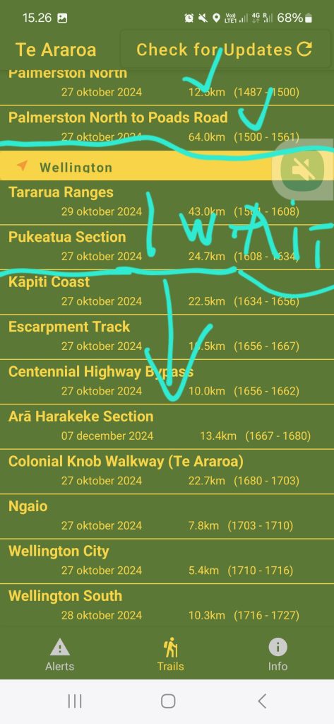 John var på arbejde, men Sally inviterede på kaffe. Rådet var entydigt: Gå ikke op i Tararuas bjergene nu. Der var for meget vind. TA går op over steder, hvor der er smalt og langt ned til begge sider. Jeg takkede og gik videre. Sendte en besked til Donna om, hvornår jeg var ved opsamlingsstedet.