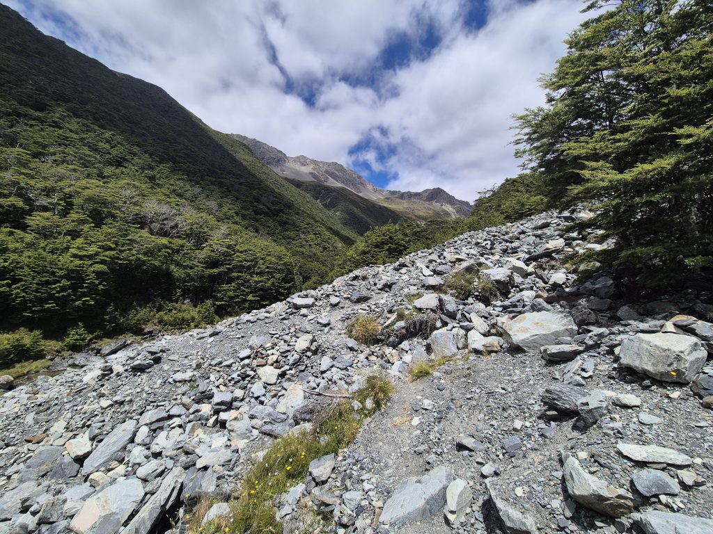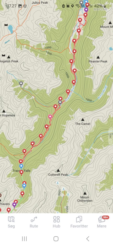 På turen til Upper Traverse Hut mødte flere vandrer, som kom i modsatte retning. Der kom blandt andre to kvinder. Den ene præsenterede sig som “the warden” og spurgte til min booking i hytten. Jeg viste min kvittering frem og hun takkede. Familien Jensen nævnte, at der havde været virkelig mange mennesker i Upper Traverse Hut, da de var der. Jeg håber, at det ikke bliver helt så galt i dag.