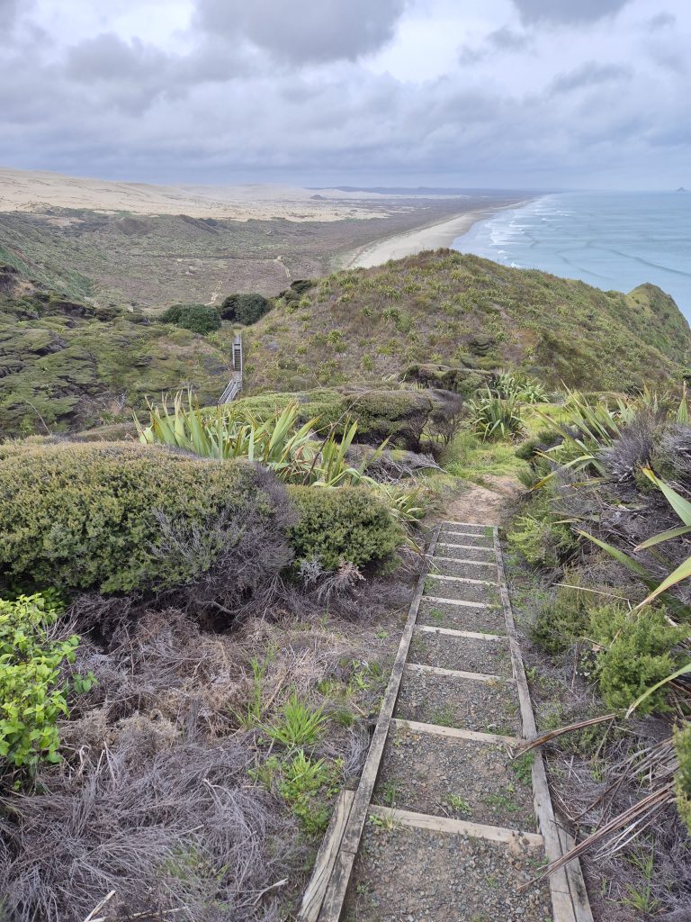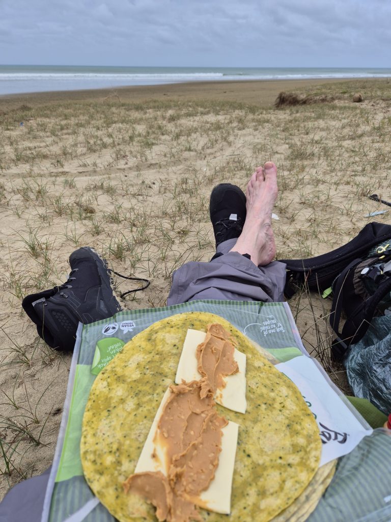 Ved stien som første væk fra stranden og op til Ahipara sad Phil. Han skulle ikke længere i dag, så han ville sige ordentligt farvel til stranden. Vi var nået til rutens km 101 og havde fuldført den første sektion. Et stort øjeblik. Både Phil og jeg har ‘mærkede’ fødder oven på strandturen, så lettelsen over at have klaret turen er stor.