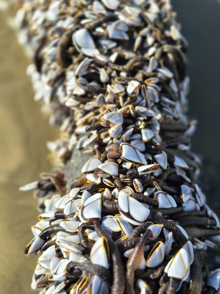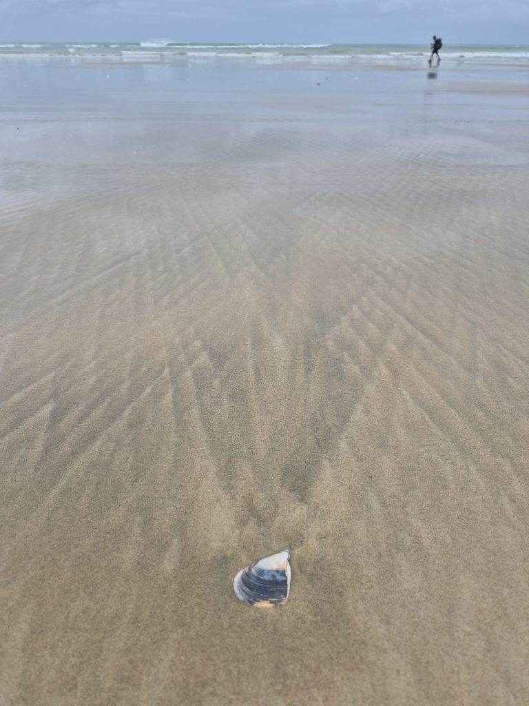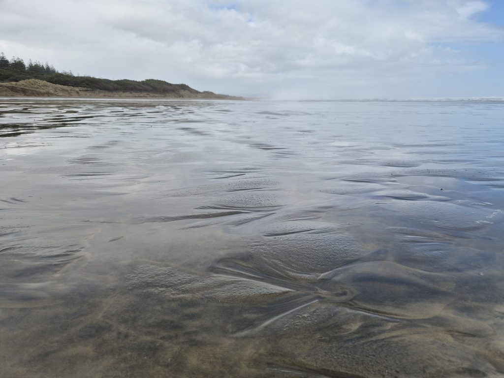 Der var stadig flot og råt derude. Stranden var lidt smallere end de forrige dage, men jeg kunne lige netop klare mig uden at indkassere en skylle. En enkelt bølge var dog tæt på, og jeg måtte haste ind mod klitterne. Den efterlod en tør stribe på 1 meter ind mod klitterne. Vi har været heldige, at højvandet har været relativt lavt. På andre tidspunkter tvinger vandet TA’erne til at holde lange pauser i klitterne.
