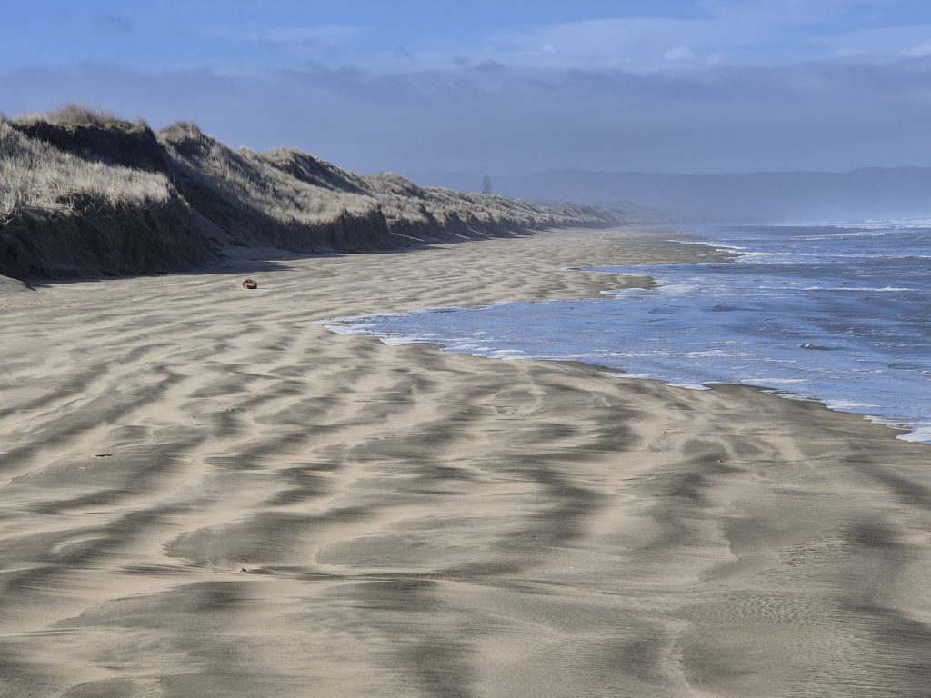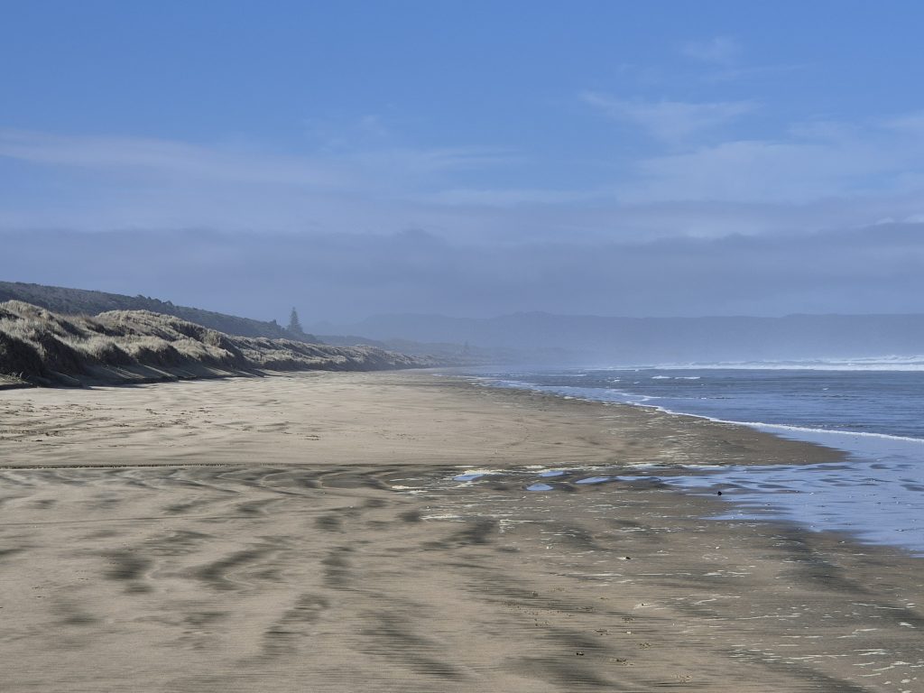 Jeg gik alene. Sara går på Canada tid. Hun er sikkert smuttet klokken 5. Jeg mødte en hundelufter, som hilste ‘good luck’ og lige før Ahipara ved enden af stranden indhentede jeg Lucas.