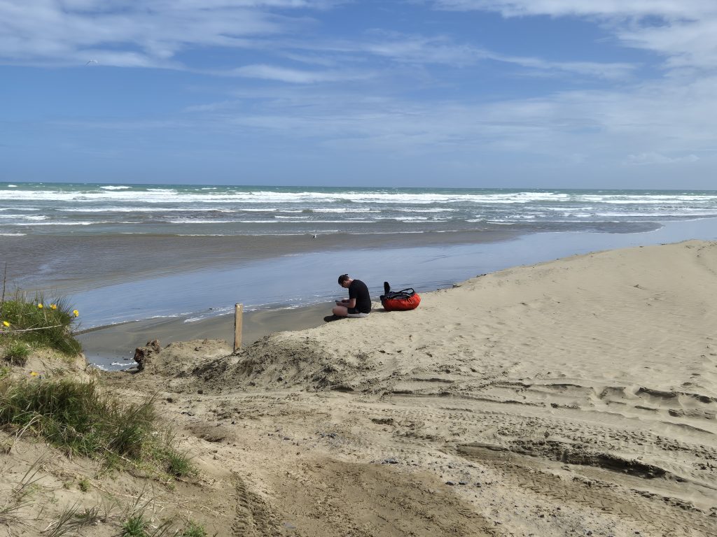 Ved stien som første væk fra stranden og op til Ahipara sad Phil. Han skulle ikke længere i dag, så han ville sige ordentligt farvel til stranden. Vi var nået til rutens km 101 og havde fuldført den første sektion. Et stort øjeblik. Både Phil og jeg har ‘mærkede’ fødder oven på strandturen, så lettelsen over at have klaret turen er stor.