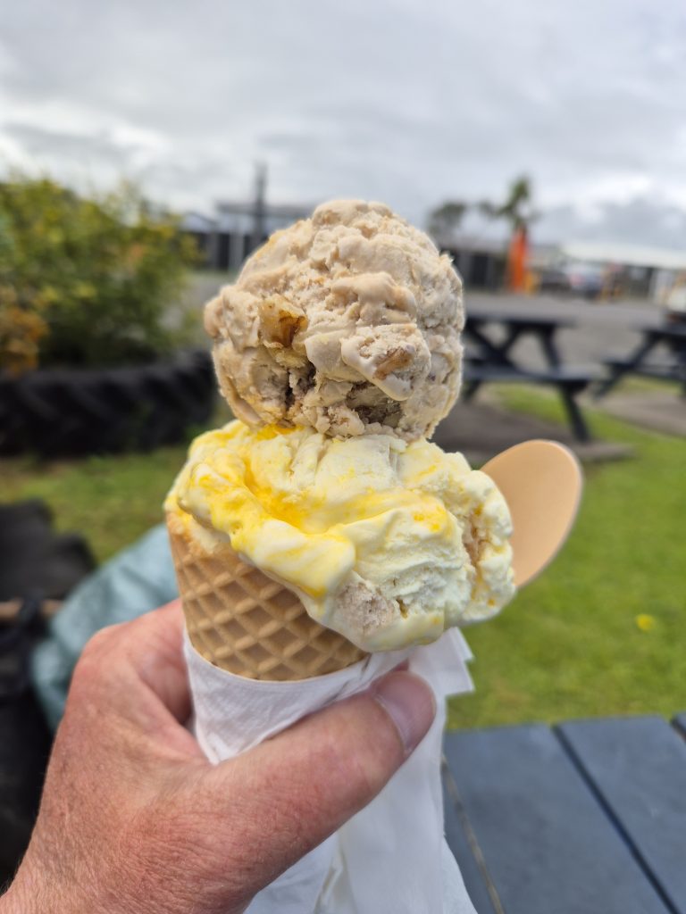 Mine fødder var venligt stemte i dag, så jeg ville op i byen og spise frokost, og så videre til Kaitaia. Ahipara var det første sted, hvor det var muligt at købe tilberedt mad. Det blev til krabber og muslinger, som havde været i frituregryden hos den lokale Take Away Bidz. Pomfritterne forsvandt i sprogforvirringen, som var markant, selvom jeg vil mene, at jeg forstår engelsk. Skuffelsen blev skyllet ned med en is, og jeg kunne konstatere, at vi var enige om, hvad ‘big’ betyder! Isen smagte skønt og kostede omtrent det samme som i Danmark.