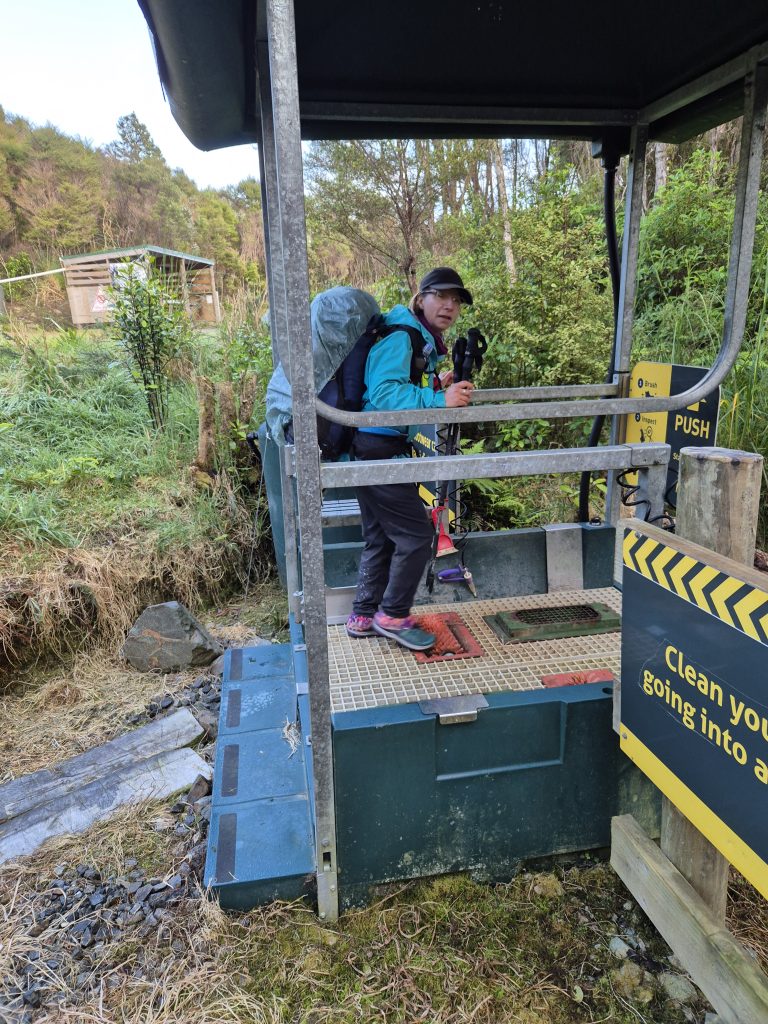 Sara og jeg var klar til afgang fra teltpladsen klokken 7. Dagens første opgave var rengøring af fodtøjet. Vi skrubbede, sprayede, stampede, inspicerede sålerne og skrubbede lidt igen. Der er ingen kur mod den sygdom, som slår kauritræerne ihjel, så vi tog opgaven alvorligt.