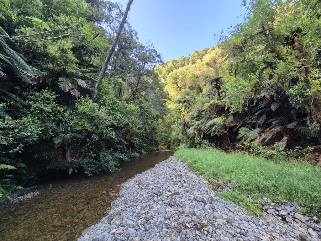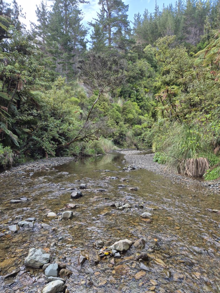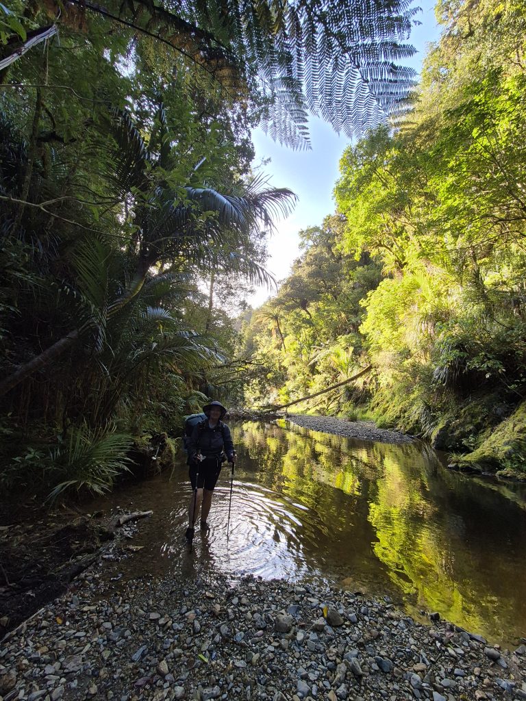Nede i kløften dukkede Mangapukahukahu Stream op. Vi betragtede vandet et øjeblik, før vi begav os mod højre (sydøst) gennem vandstrømmen. De næste par timer zig-zaggede vi gennem floden. Det gjaldt om at finde sandbanker, stenbankerne og steder med lavt vand. Der var bestemt steder, hvor der var dybt. Vandet var koldt, men det var sjovt og anderledes at komme gennem skoven på den måde. Omgivelserne var ualmindeligt flotte og grønne.