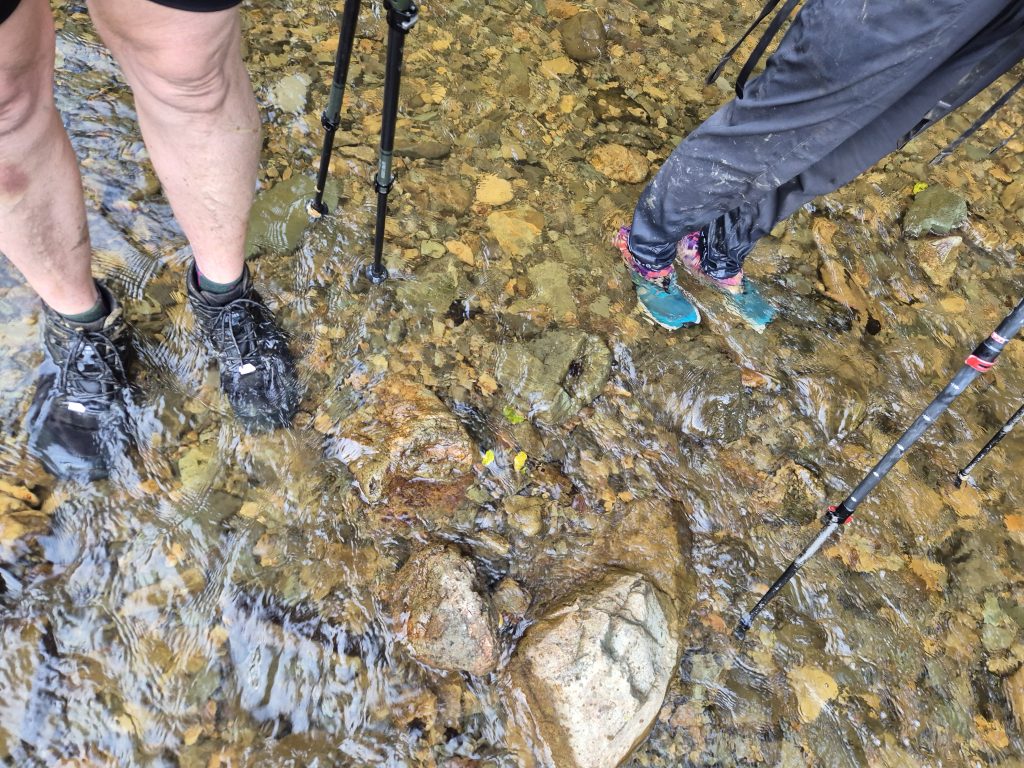 Det lykkedes os at finde den rigtige sti, og efter et par forgæves forsøg kom vi ned til floden igen og krydsede over floden med tørre rygsække. På den anden flodbred førte ruten af en smal sti op og ind i skoven. Vi tog en kort pause, og så var vi på vej igen.