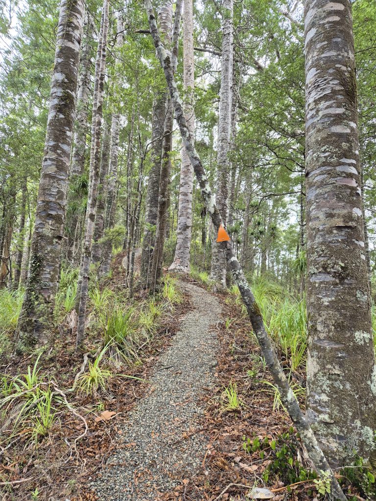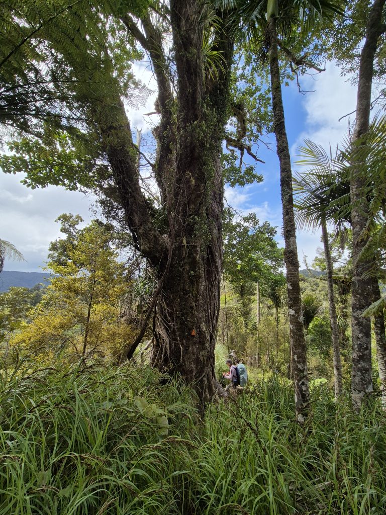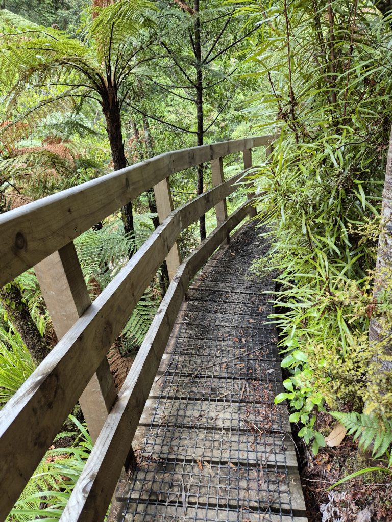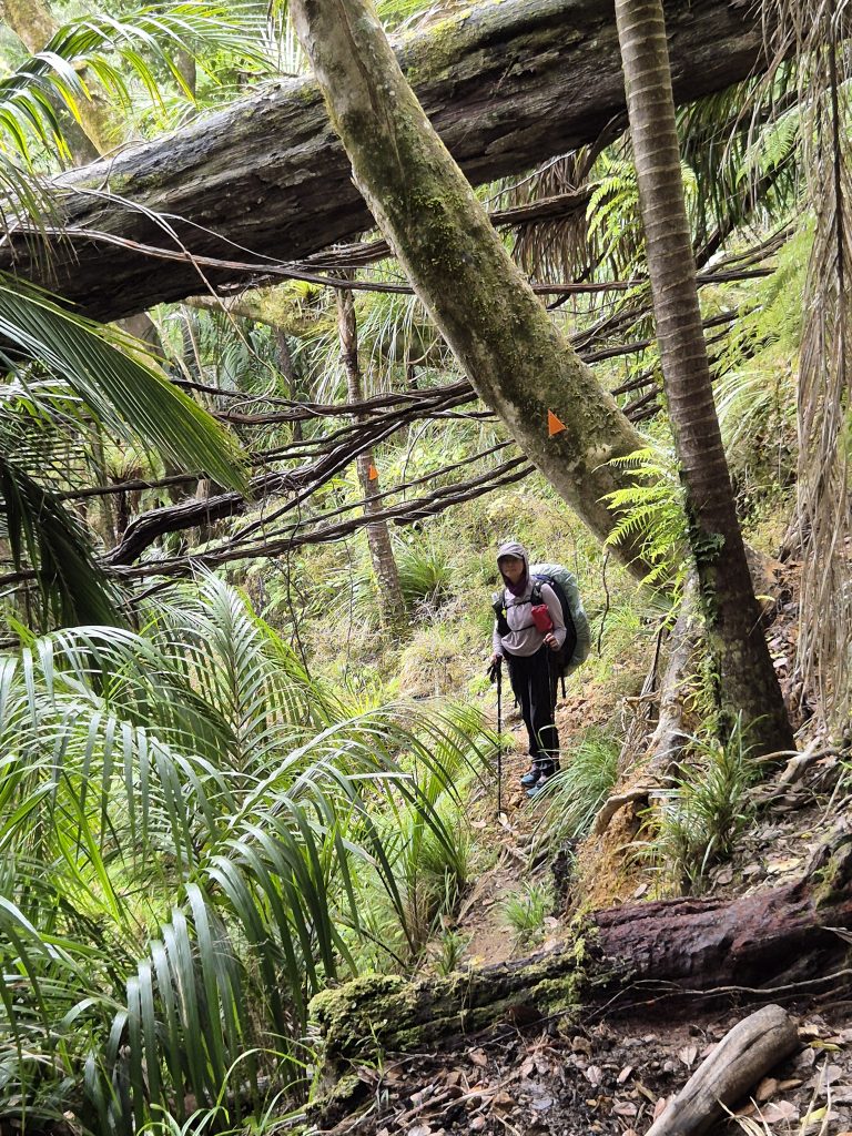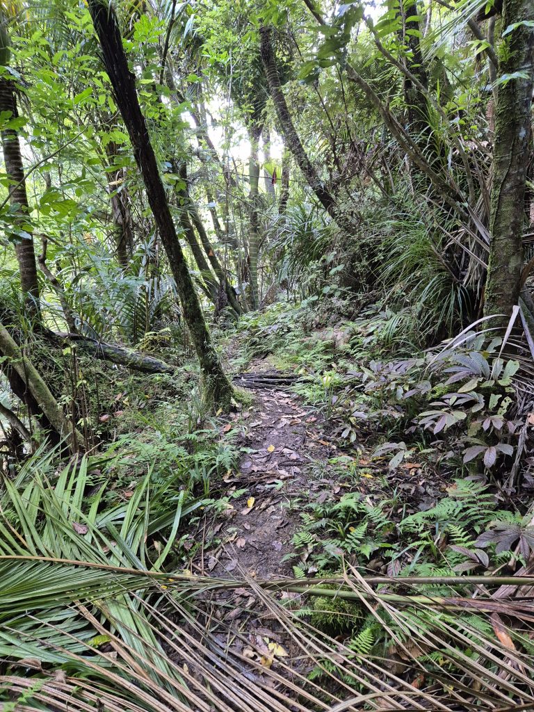 Noterne omtaler 2,5 kilometer langs floden ad Lower Waipapa River Track og der efter 3,5 kilometer ad Pukatea Ridge Track. Om det var den ene eller anden sti, aner jeg ikke, men det føltes som om, at stien blev smallere og smallere og fyldt med flere og flere væltede træer. Stien blev stormskadet i 2023. Flere steder var den oprindelige sti skredet ned af skrænten, og mere eller mindre anvendelige omveje havde formet sig. Det gik meget langsomt og det var anstrengende. Mine i forvejen hårdt prøvede lemmer protesterede. De havde ikke brug for 3 timer med atletiske øvelser. Men videre skulle vi.