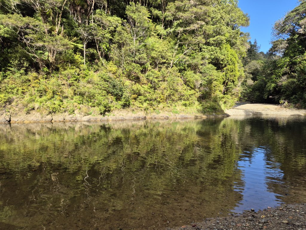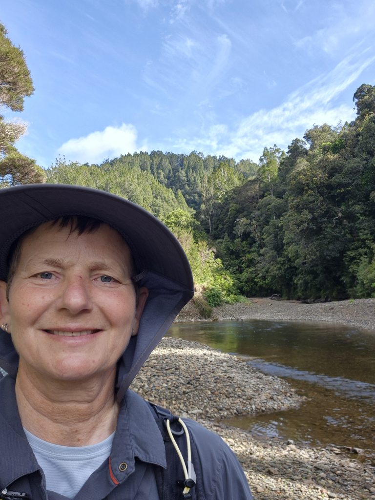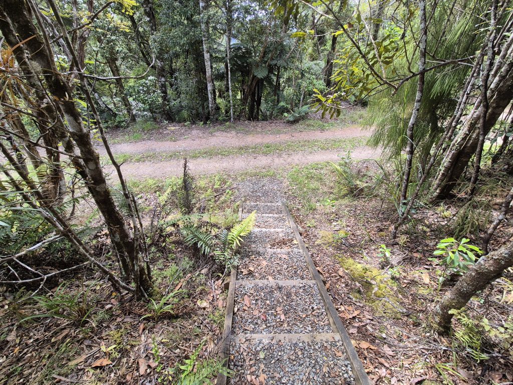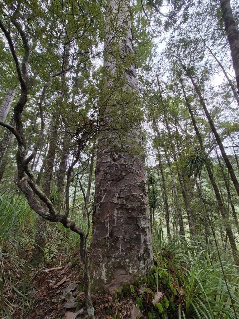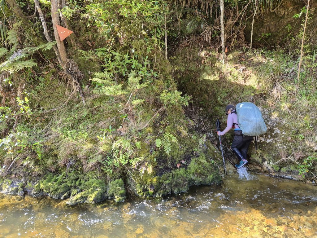 Noterne omtaler 2,5 kilometer langs floden ad Lower Waipapa River Track og der efter 3,5 kilometer ad Pukatea Ridge Track. Om det var den ene eller anden sti, aner jeg ikke, men det føltes som om, at stien blev smallere og smallere og fyldt med flere og flere væltede træer. Stien blev stormskadet i 2023. Flere steder var den oprindelige sti skredet ned af skrænten, og mere eller mindre anvendelige omveje havde formet sig. Det gik meget langsomt og det var anstrengende. Mine i forvejen hårdt prøvede lemmer protesterede. De havde ikke brug for 3 timer med atletiske øvelser. Men videre skulle vi.