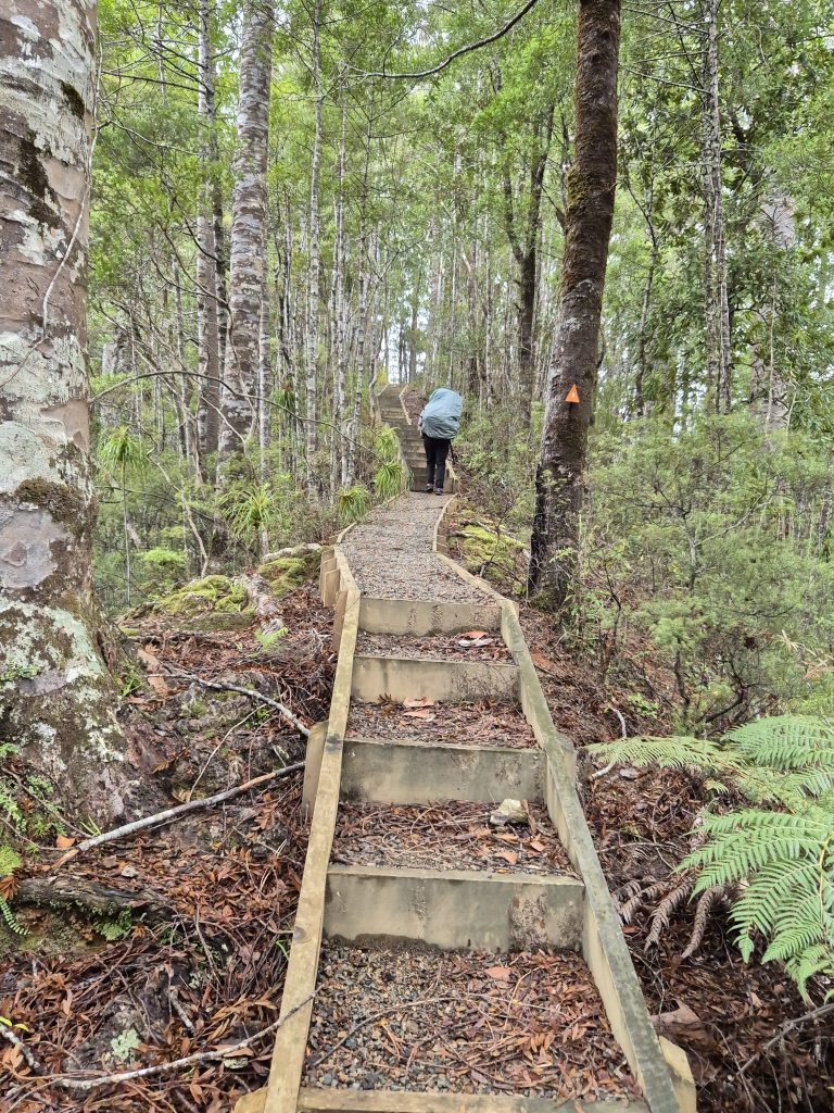 Pukatea Ridge Track gik stejlt opad til Pirau Ridge. Fra bjergkammen kunne vi et par gange se ud over skoven til begge sider. En kort overgang var opstigningen pludselig godt hjulpet af trapper og gangbroer. Det var en lettelse og tempoet steg lidt. Nu blev der igen tid til at nyde de flotte omgivelser. Vi havde i timevis kun koncentreret os om at sætte fødderne de rigtige steder. De kæmpestore kauritræer og tusinde andre flotte vækster var en fryd for øjet. På det sidste stykke mødte vi nogle af vandrevennerne. De så mere eller mindre brugte ud. Dem, som var i bedst form, havde energi til at skynde sig op ad trapperne. Det lod vi os ikke gå på af. Vi havde (næsten) vundet vores egen sejr.