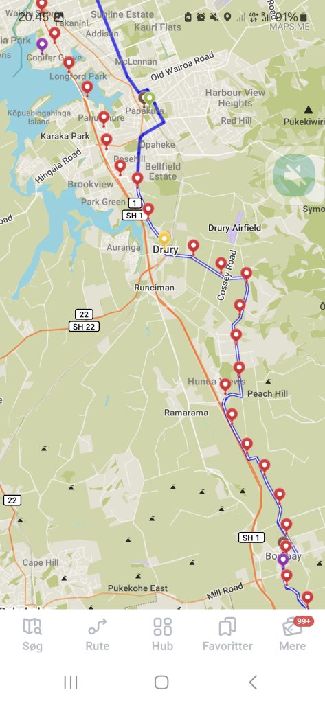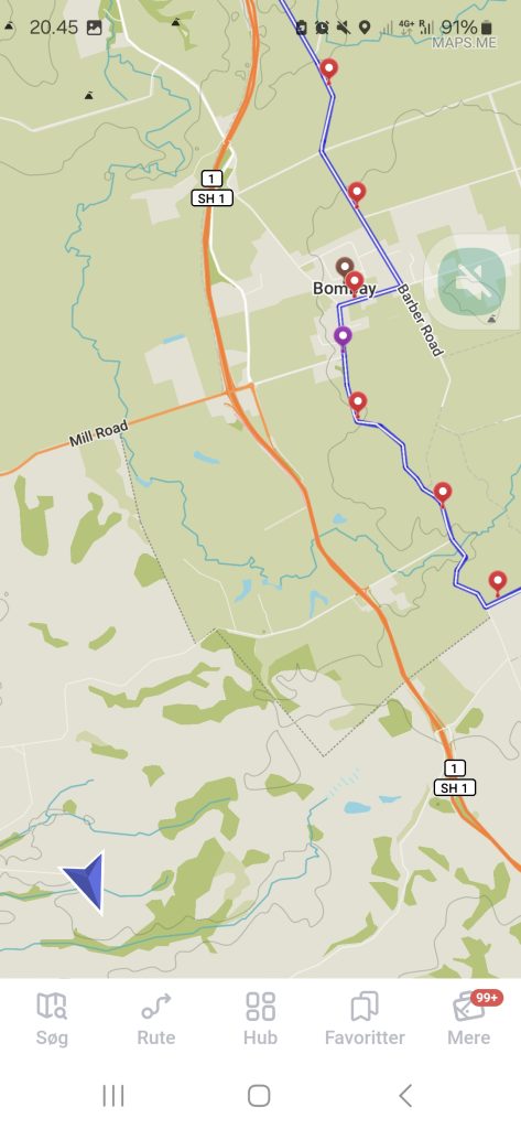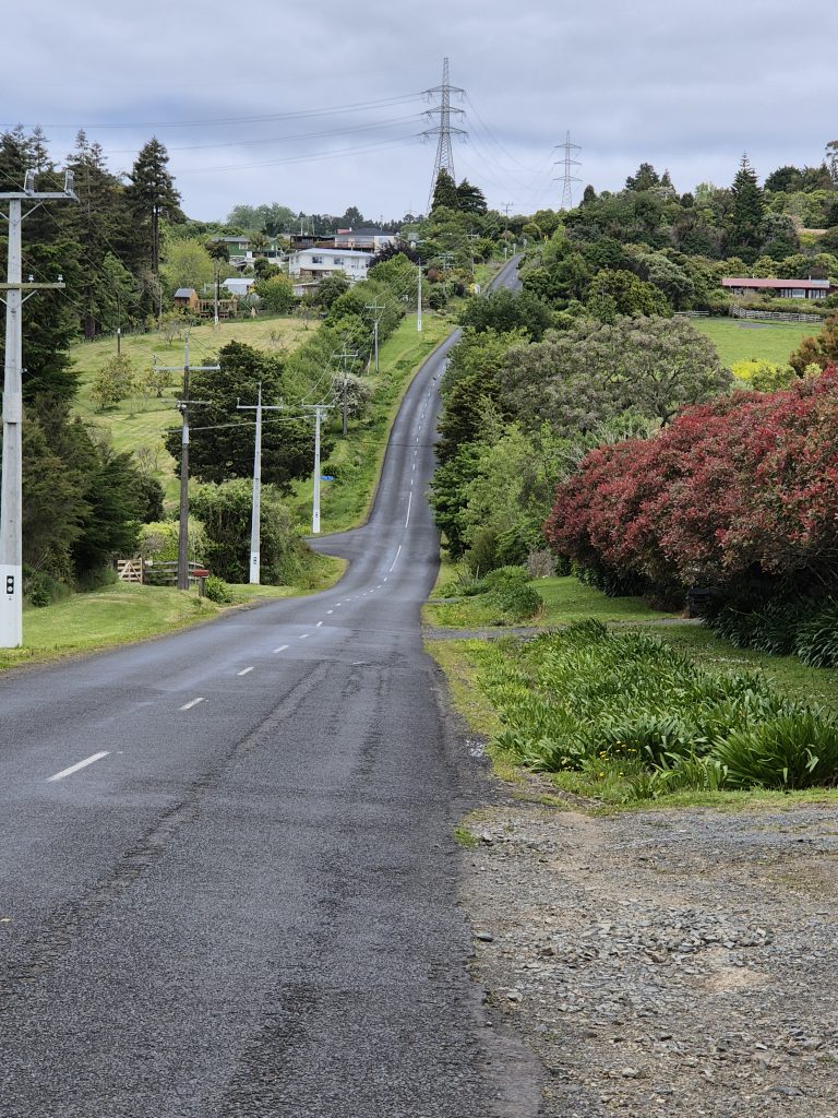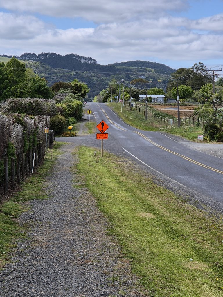 På den anden side af den store bakke styrede ruten ud mod Statehighway 2. Det var nødvendigt at gå et par kilometer langs den store vej for at komme til den næste fine rute, som var Mangathawhiri River trail.