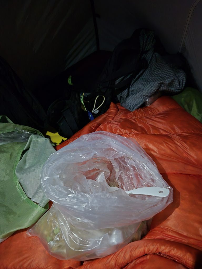 Jeg var oppe før solen. Morgenmaden blev en pose opblødt müsli, som jeg indtog i min varme sovepose. Det pjaskvåde telt blev pakket ned i rygsækken. Vandflaskerne var fyldt op med filtreret vand fra teltpladsen. Der var ingen forsyningsmuligheder før den næste teltplads 18 langsomme kilometer senere. Det officielle tidsestimat for rutrn er 9,5 timer. I noterne vurderes det som ‘lavt’, og jeg kunne læse, at der ikke er usædvanligt at bruge 12-15 timer.