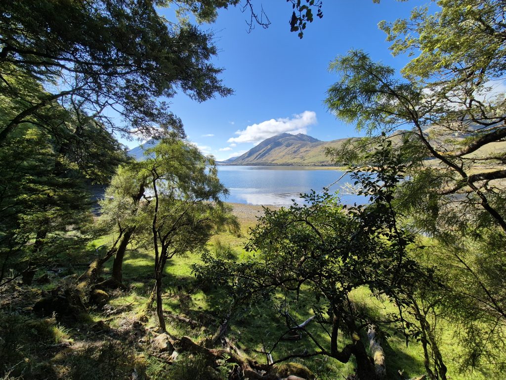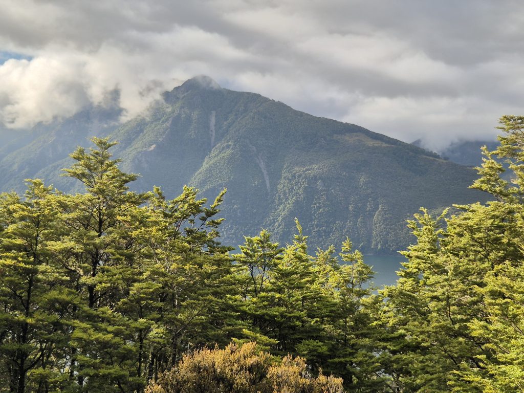 Ruten fortsatte gennem skoven, som var flot og fuld af fuglefløjt. Stien var kuperet, men forholdsvis nem. Jeg nåede til Tree Mile Stream og passerede en svingbro og kom tilbage i skoven. Ruten fulgte søbredden og i den fjerne ende af Lake Sumner var der flot udsigt over søen.