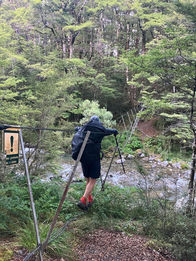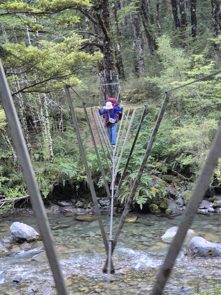 Dagens første begivenhed var en trewirebro over Cameron Stream. Det var muligt at vade gennem floden, men vi ville begge to gerne afprøve wirebroen. Konstruktionen består af én wire, som man går på og to wirer, som man kan holde hænderne på. Jeg gik først. Det var ikke vanskeligt, selvom det så faretruende ud.