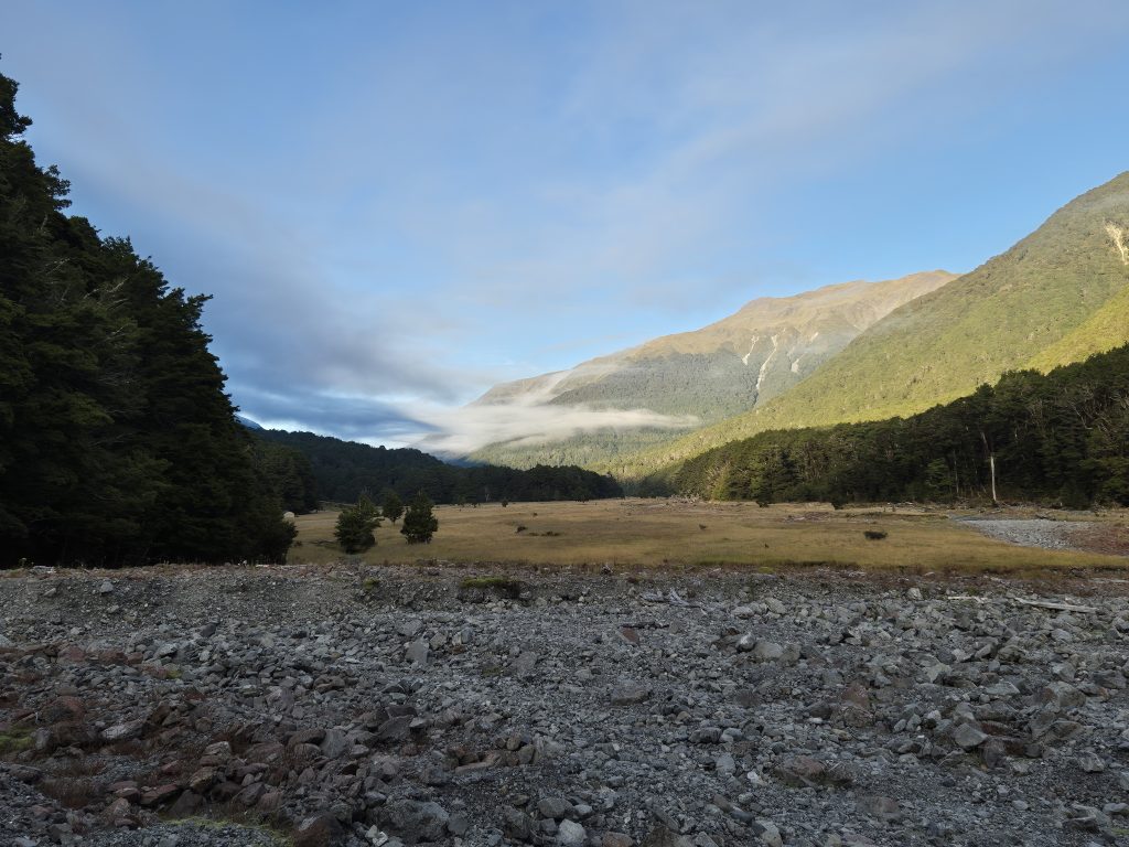 Eftermiddagen sluttede med fem kilometer langs Otira River til Morrisson Footbridge. Det kneb med at blive enige om, hvilken rute vi ville tage. Becky ville gerne op på Taramakau Floot Route, som gik på skråningen over floden. Jeg ville hellere ned og gå på stenene langs eller i floden, selvom det var anstrengende. Årsagen til det var, at noterne beskrev højvandsruten, som dårligt vedligeholdt og frarådede, at man tog den, hvis vejret tillod at man gik i floden. Det er sjældent, at noterne fraråder en rute, så jeg var sikker på, at der ikke var rart der oppe.