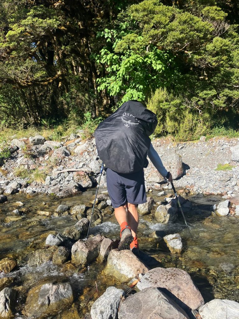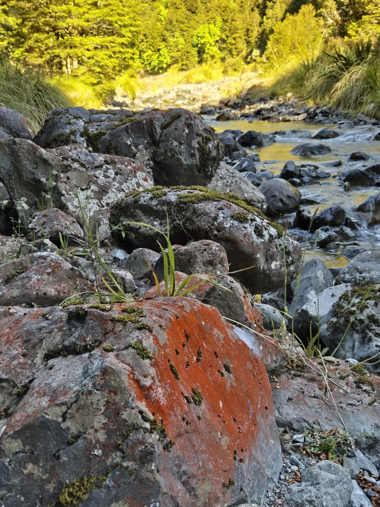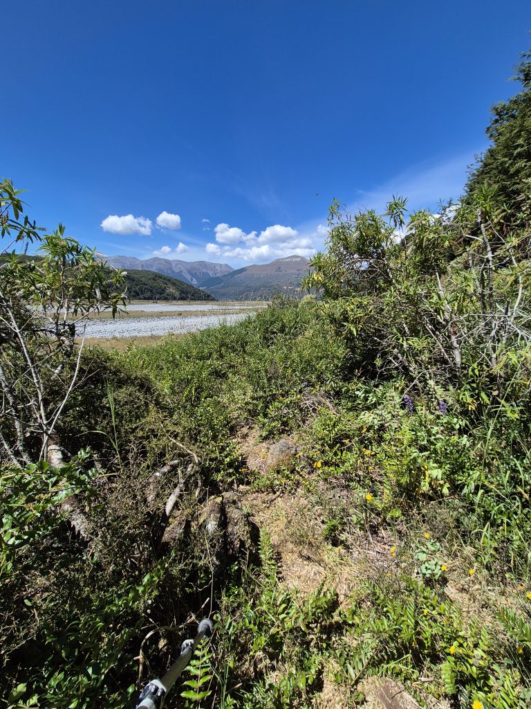 Hele sektionen er præget af vand. I dag var ingen undtagelse. Vi gik først langs Taramakau River og bag efter langs (og i) Ōtira River. Stien skiftede mellem flodbredden og kortere udflugter ind mellem træerne. Nogle steder var der stikkende buske, som vi måtte mase os igennem.