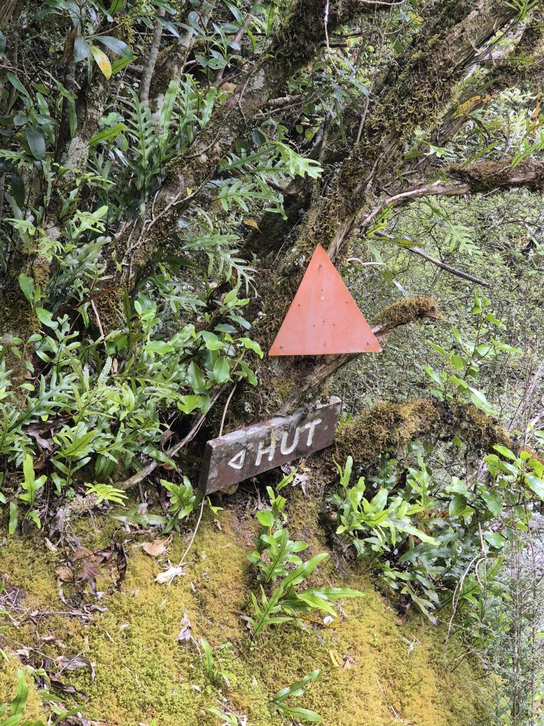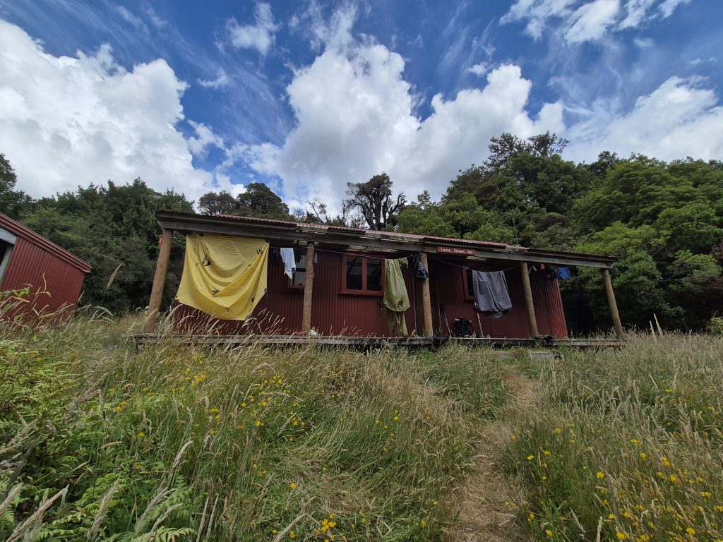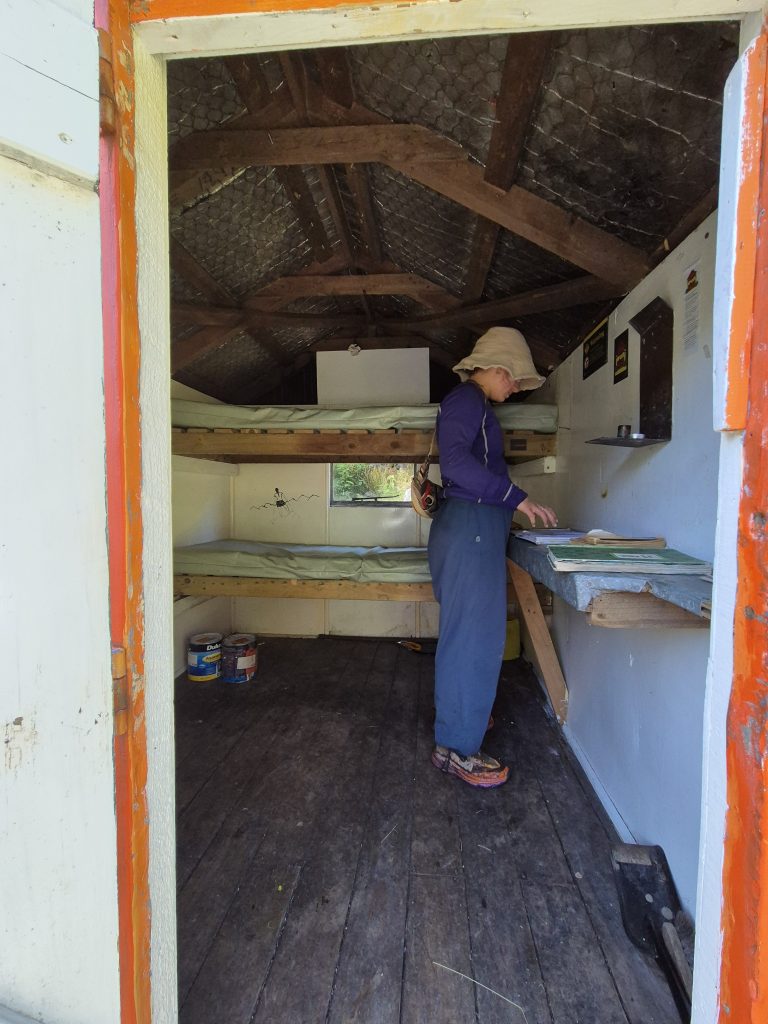 Efter dagens højeste punkt passerede jeg den lille A-hytte Lagoon Saddle Hut. Der var én seng. Det så hyggeligt ud.