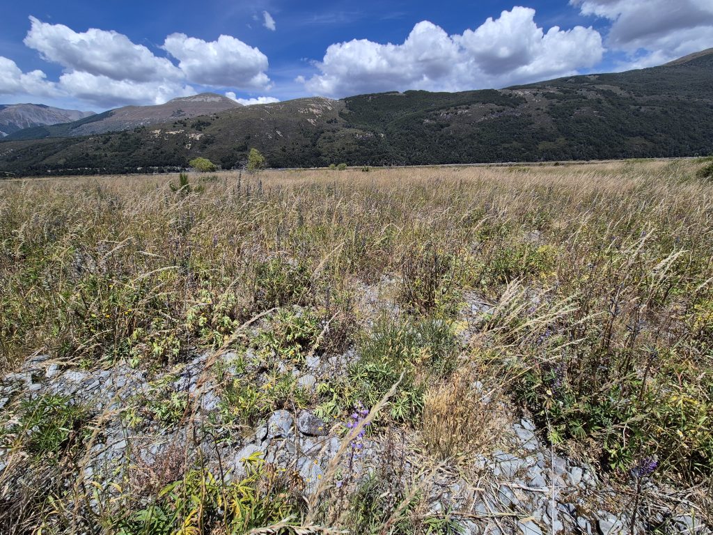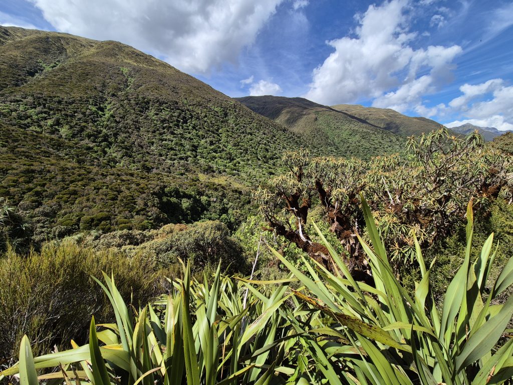 De første kilometer gik stien jævnt hen over engen. Efter en times tid gik turen op over Kiwi Saddle. Jeg tog en lille afstikker til et udsigtspunkt, som ikke imponerede. Jeg kunne kun se en flig af Lake Sumner under mig. Det mest imponerende var bjergene på den anden side af søen.