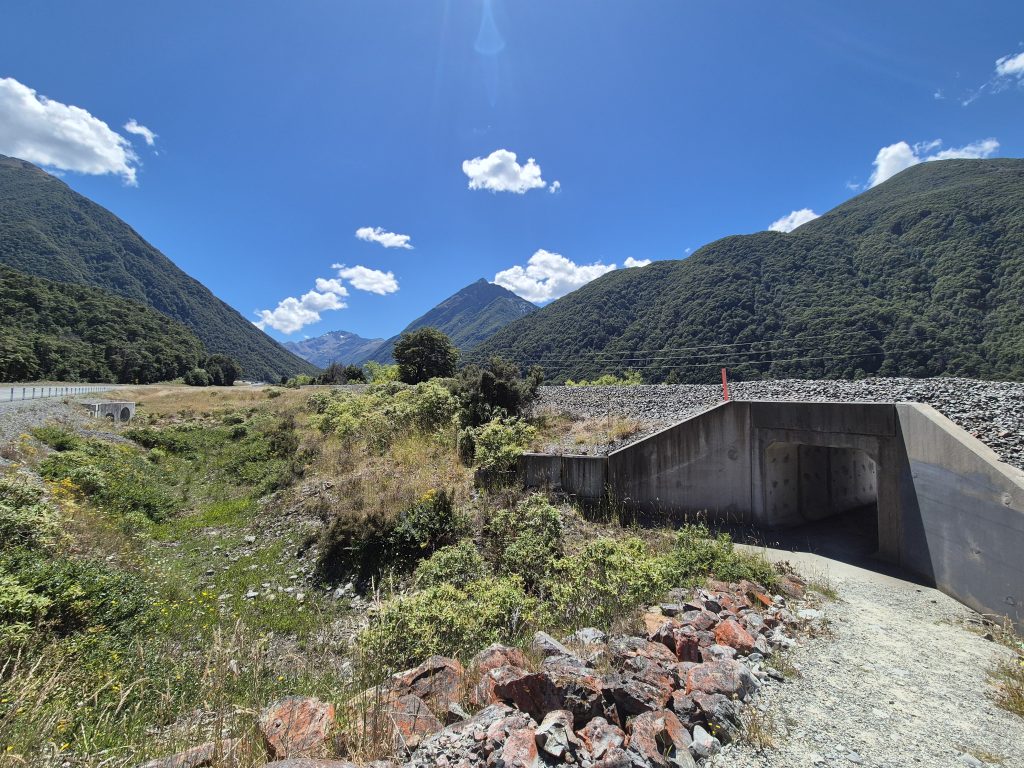 Nu var der cirka ni kilometer til Bealey Spur, hvor Ecolodgen ligger. Jeg gik tilbage gennem tunnellen under jernbanen og ud til den grusvej, som vi ankom fra i går. Denne gang drejede jeg til højre og fortsatte kursen fra i går. Jeg kom ud i et område med store sten og jeg havde problemer med at finde ruten.