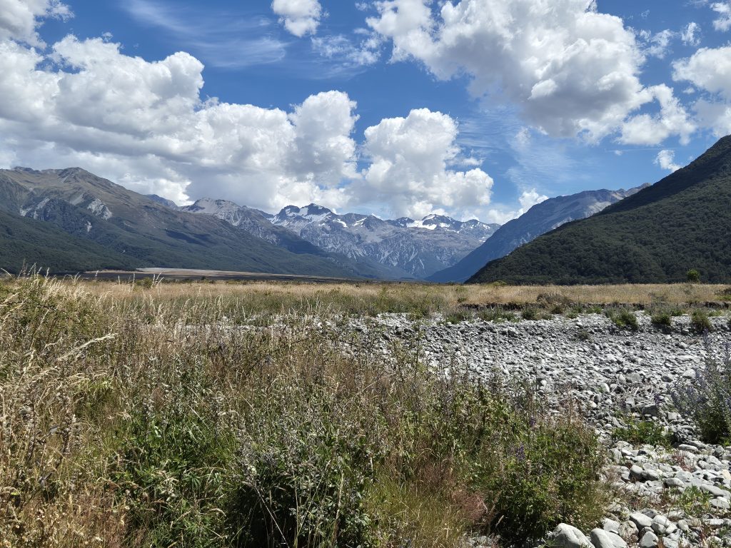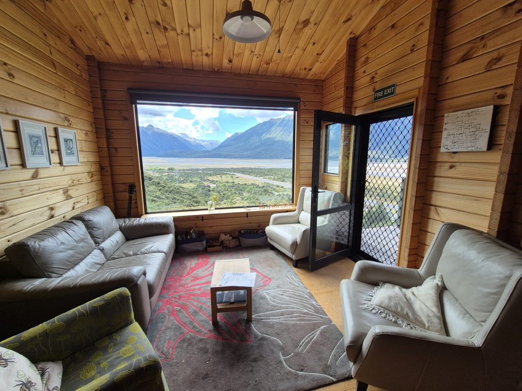 Jeg har hele huset for mig selv. Udsigten fra stuen og altanen er formidabel. Jeg kan se Bealey River og Waimakariri River og i baggrunden er der flotte bjerge. Floderne er forgrenede og det ligner en kæmpe flodseng med mange små floder.
