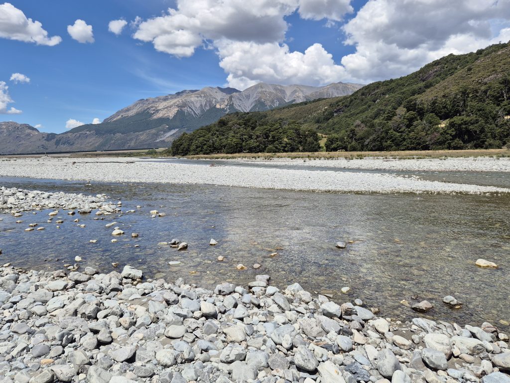 En halv times tid efter kunne jeg se Waimakariri River, som jeg skulle krydse. Der lå en stor klynge træer på den anden side. Bag dem måtte Bealey Hotel ligge.