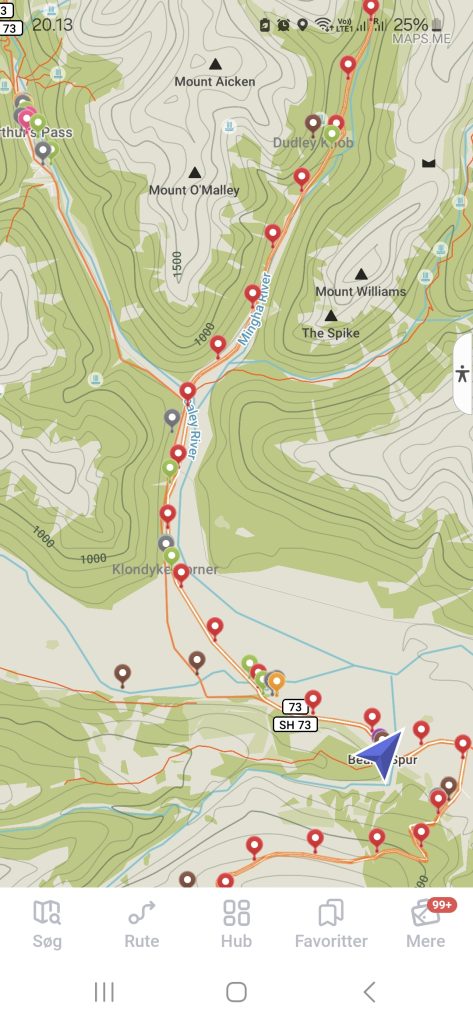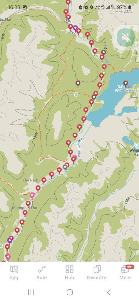 Dagens næste oplevelse kom, da jeg nåede til et vandløb, som jeg antog, at jeg ikke skulle passere. Retningen var forkert og der var ingen afmærkning. Jeg gik tilbage og endte med at løbe i cirkler i en halv times tid før jeg besluttede, at jeg nok alligevel skulle prøve at passere vandløbet. Jeg krydsede vandløbet og kort efter kom der en afmærkning og stien drejede skarpt til højre. Nu gik jeg i ‘den rigtige retning’. Jeg er med garanti den eneste, som har formået at fare vild der. Det var faktisk ret lige til. En kilometer længere fremme fløj en stor fugl hen over stien. Det var en kea! Der var to og jeg iagttog dem længe. De var store og flotte.