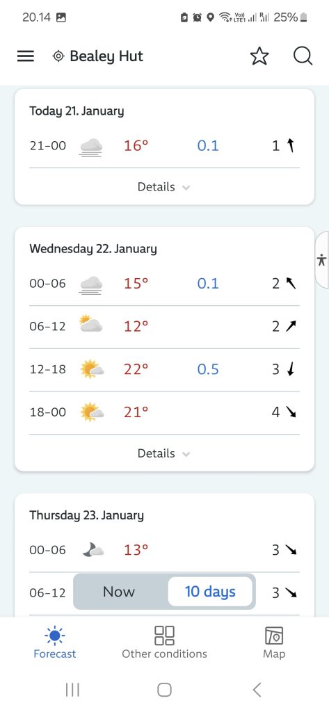 Vejrudsigten ser noget broget ud. Vi risikerer, at det regner så meget, at vi må vente på at vandstanden i floderne falder. Derfor er det vigtigt, at vi har rigeligt med mad i rygsækken.