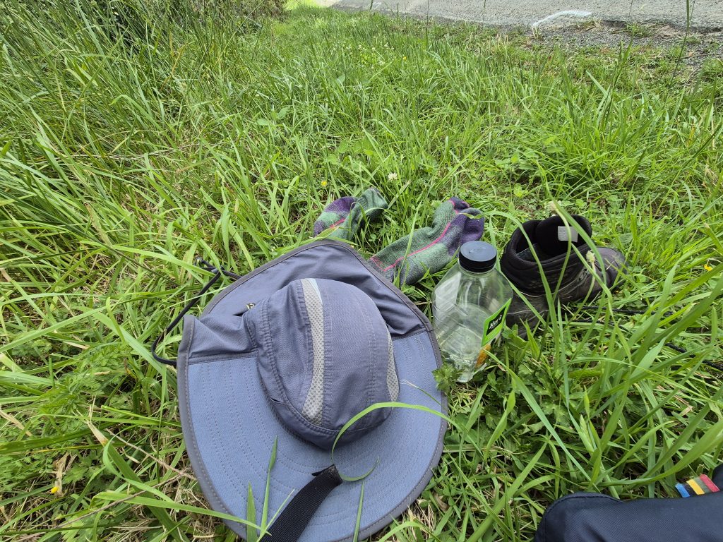 Mit telt var dejlig tørt, da jeg stod op. Ingen kondens. Det var en sjældenhed. Det har været meget lunt om natten de sidste par dage, og i dag var der også lidt vind. Himlen så meget grå ud, så jeg skyndte mig at hive alt mit grej op under halvtaget foran køkkenet. Der endte jeg med at have base i de næste tre timer. Jeg spiste lidt morgenmad, drak kaffe og ordnede kontorarbejde. Det var en behagelig morgen. Uden regn.