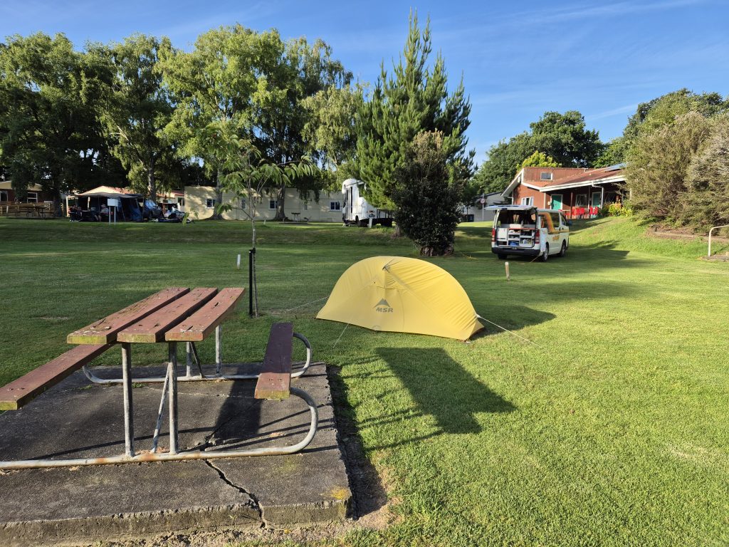 Da jeg kom tilbage til teltvognen dukkede ejeren op. Vi fik en snak om Whanganui og om TA. Nu er jeg alene på skansen og teltvognen kalder. I morgen skal jeg ud og have våde fødder igen.